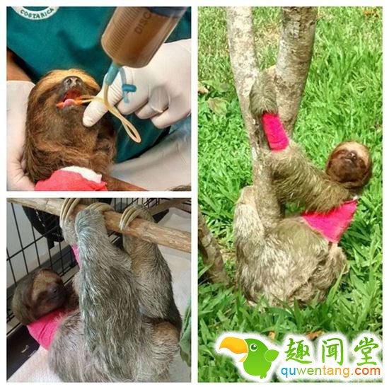 上图是一只名为雪碧的树懒孤儿。雪碧掉落到地上被发现,当时它营养不良,有生命危险,工作人员隔三小时就得喂它羊奶。