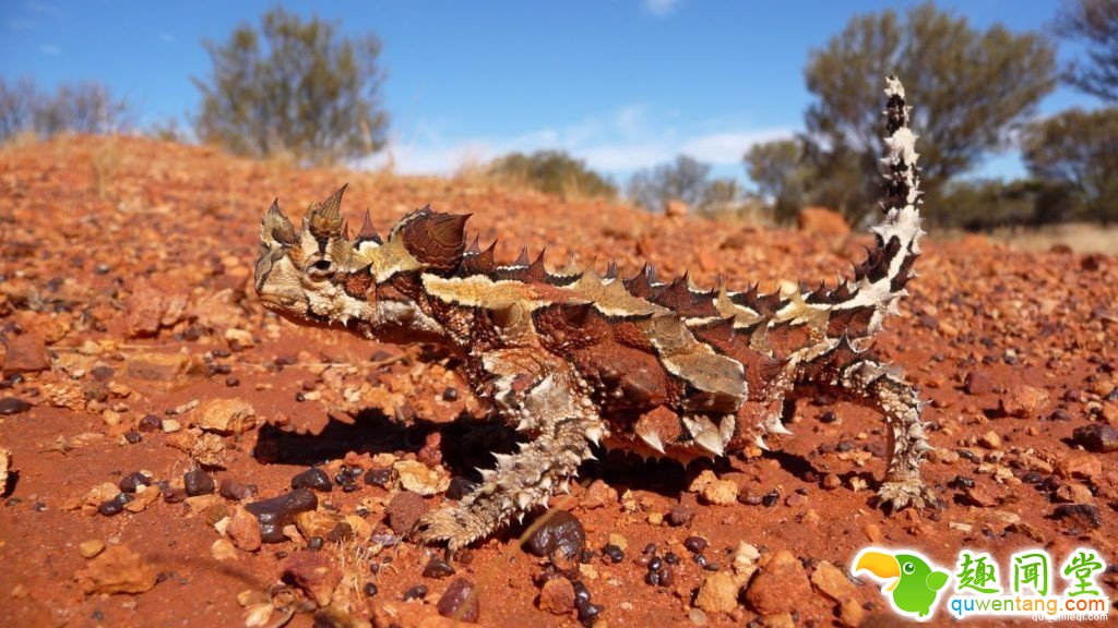 这种生活在澳洲的棘蜥,长度大约是20cm,可以活上15~20年,并有着像着怪物的外表,全身上下充满着棘刺,就像是会走路的仙人掌一样,还有着先进的皮肤迷彩,可以随着太阳日照角度不同变色。有趣的是,它舌头细长,只能黏着小只昆虫,就算走过绿洲,也没办法喝上一口,难道说这种生物真的不用喝水也能生存吗?