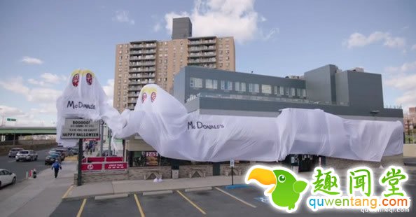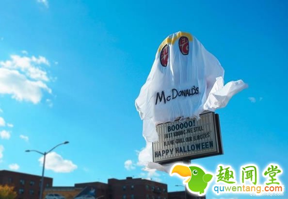 位于纽约皇后区的汉堡王,为了万圣节,大玩“反串”,在招牌上盖上大大白布,挖了两个洞,搭配黄色的M字,写上McDonald’s。