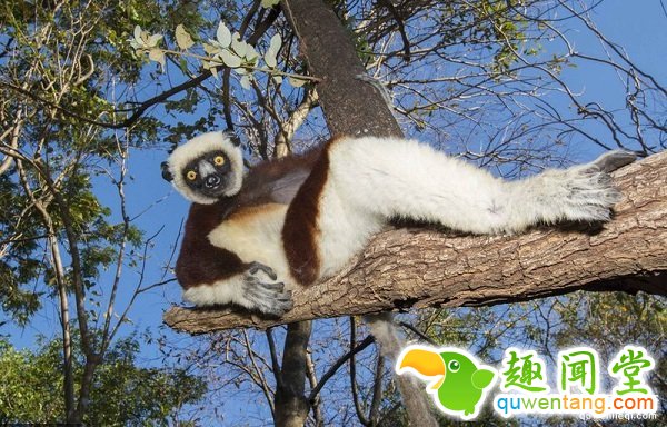 一只雌性狐猴躺在树干上,姿势就如同凯特·温斯莱特在电影《泰坦尼克号》里面摆出的pose一般。这只狐猴是一群狐猴的家长,毫无疑问的占据着“舞台”的中央,在四米高的树干上,它惬意的为摄影师摆着pose。