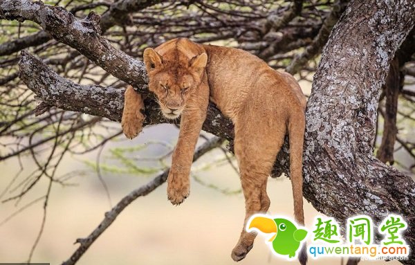 坦桑尼亚塞伦盖蒂国家公园,一头年轻公狮子趴在树枝上睡着了。