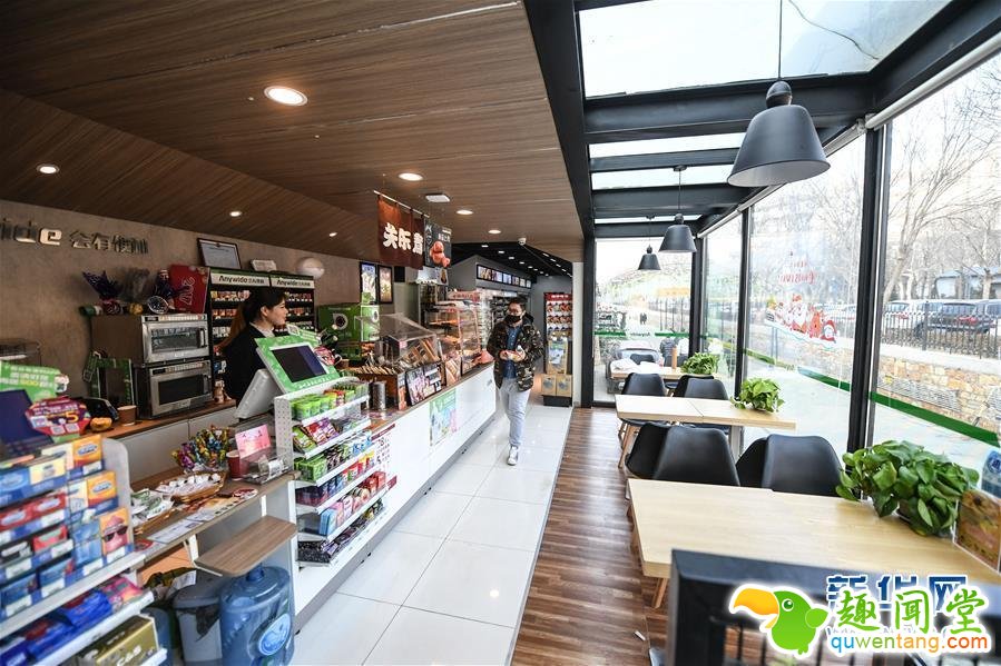 12月22日,一名顾客选购商品后走出火车主题便利店。辽宁省大连市将淘汰的绿皮火车进行改造,打造集文创、商业为一体的青年创业创意社区,建成占地2万平方米的双创火车小镇,共有20节绿皮火车车厢。目前有社区便利店、创意花坊、连锁简餐等创业项目入驻创意小镇。新华社记者 潘昱龙 摄