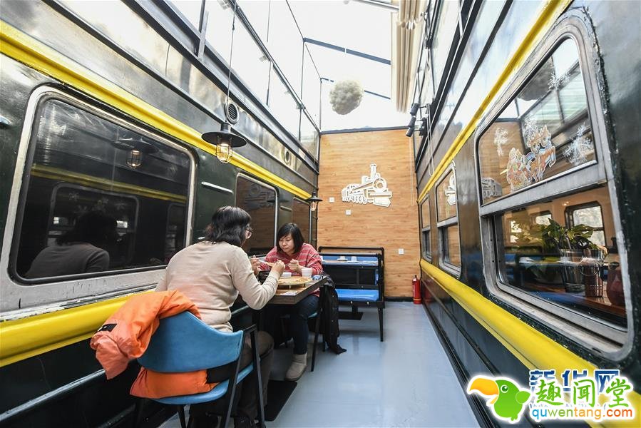 12月22日,顾客在大连双创火车小镇的特色餐厅就餐。辽宁省大连市将淘汰的绿皮火车进行改造,打造集文创、商业为一体的青年创业创意社区,建成占地2万平方米的双创火车小镇,共有20节绿皮火车车厢。目前有社区便利店、创意花坊、连锁简餐等创业项目入驻创意小镇。新华社记者 潘昱龙 摄