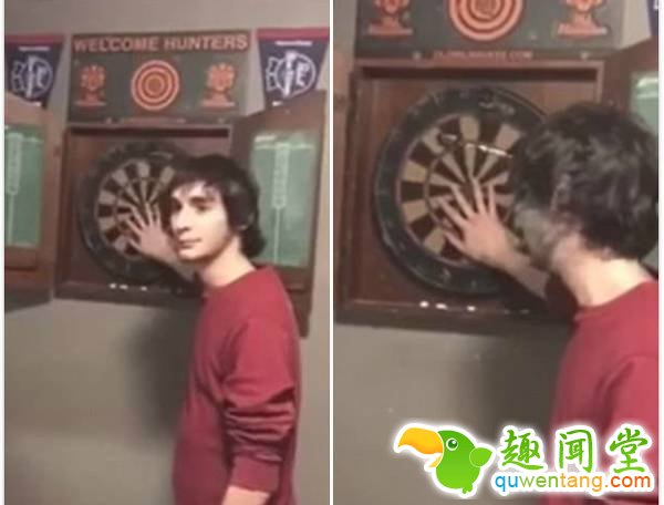 据英国《每日邮报》4月1日报道,近日,美国一名男子怂恿其醉酒状态的朋友进行大冒险游戏,自己用手盖住飞镖盘的靶心。谁曾料到,他转头看飞镖盘的瞬间,朋友手抖用飞镖击中了他的前额,他却淡定自若,在朋友的帮助下拔出了头上的飞镖。这段搞笑视频在社交媒体上疯传,仅一天的访问量就达到了2万多次。