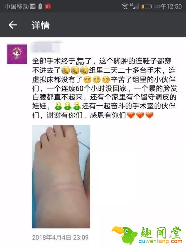 4月4日晚上11点09分,忙完一天手术的张春花医生发了这样一则朋友圈, 她自嘲: “全部手术终于结束了,这个脚肿的连鞋子都穿不进去了……”