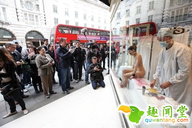为向人展示这个过程动物的痛苦,PETA邀请一位表演艺术家,在伦敦Lush摄政街店的橱窗,面相公众做了一个10个小时的人体实验表演。