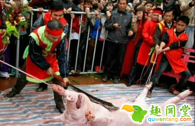 猪肉是比较平常的食物,那各国人民是如何杀猪的呢?每个国家的方式都会有一定的差别。越南杀猪会先把猪绑起来,四个人分别拖住猪的四肢,然后有一个人拿着大砍刀,朝着猪身上砍,直到猪失去生命。
