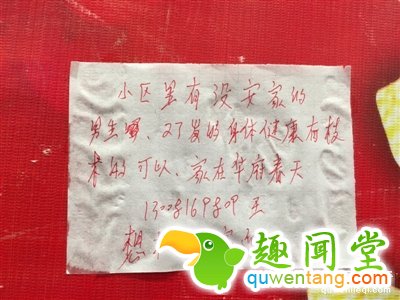 11月3日晚8时50分许,家住邦泰华府公馆的袁先生回家时,被小区电梯内的一则手写“征婚告示”吸引了。一张A4纸上,用红色签字笔写着:小区里有没安家的吗?27岁的,身体健康有技术的可以,家在华府春天。下方还留着一个电话号码和一个“王”字。