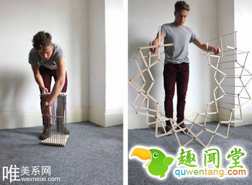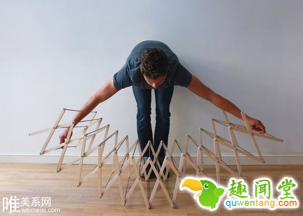 设计师 Aaron Dunkerten 打造的折叠式晾衣架,由几十条木板组成并以铝合金金属棒连接加固。