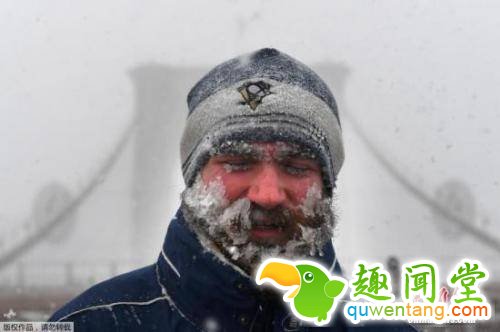 资料图:纽约布鲁克林大桥上,一名行人行走在漫天暴雪中,脸上布满冰碴。