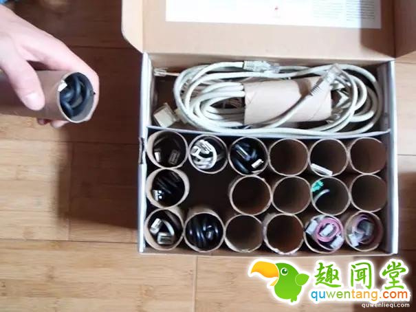 卫生纸中间的纸筒不要扔,可以用来收纳线缆。