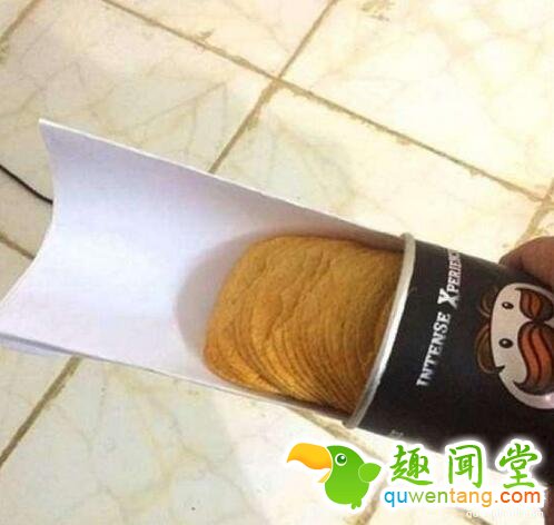 ▼桶装洋芋片让你有些费劲,把A4纸对摺放进去,洋芋片就通通完整的取出来,是不是很神奇?