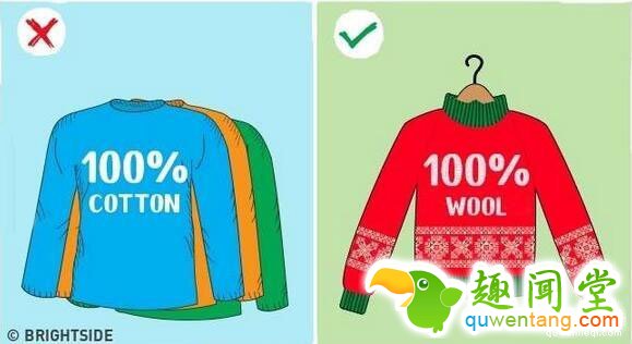 ▼天冷时穿对衣服:我们都知道,皮肤湿漉漉的话,热量会散发得很快,想要保暖,首先要尽可能保持皮肤干燥。羊毛这种材料吸水效果最好,出汗后体温也不会下降太多,天冷时选这种材料的衣服最合适。
