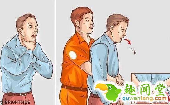 ▼防止被食物噎死,学会哈姆立克法:急救者站在被噎住人的后方,一只手握拳向横隔膜位置(大约在肚脐上方)施压。另一只手握住这只手施压,就像把对方抱起来一样。这样的动作会压缩肺部,强迫异物排出气管。