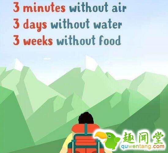 ▼出游时记住这3点:你最多能在没空气的情况下活3分钟;最多3天不喝水;最多3周不进食。