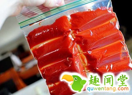 做菜的时候只会放一点点番茄酱,但瓶子里剩下的那部分很容易变坏。如果想让它保持新鲜,就把剩下的番茄酱放入密封好的塑料袋中,并如图分出一块块区域,想要再用的时候,挤出一小块就可以了。