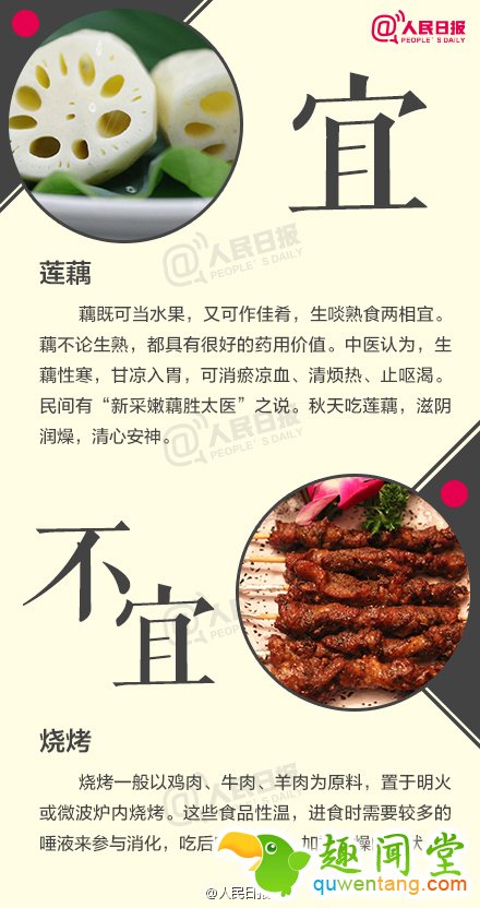 2. 不宜:烧烤;宜:莲藕;