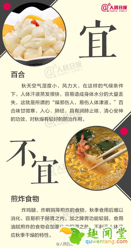 8. 不宜:煎炸食物;宜:百合;