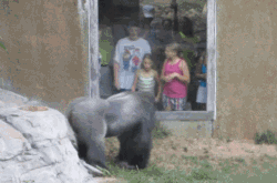 这发生在美国的一个动物园…. 片里面的这个,是一只园里很著名的银背大猩猩Kijito,它试图从背后袭击这个哥们… 但是被厚厚的玻璃墙挡掉… 这样的场面,一下就在网上火了起来……