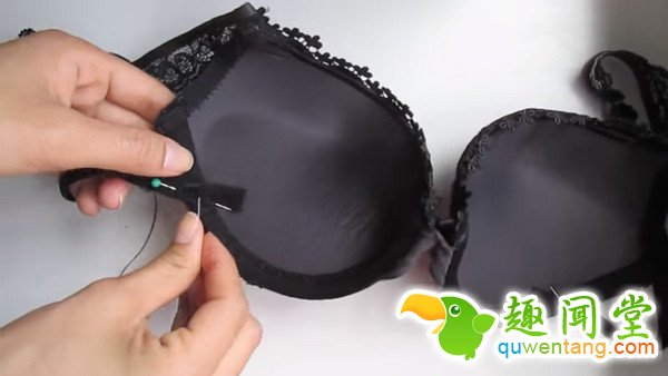 ▼第二刀:将右边内衣背带沿着内衣钢圈边剪下。