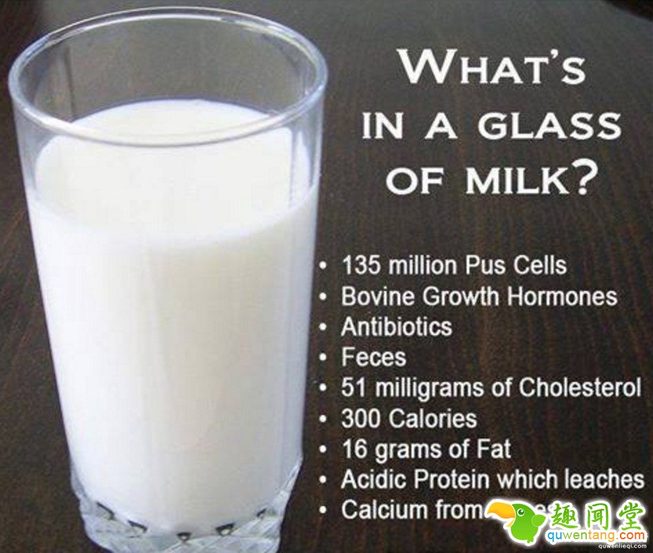 虽然牛奶中的确含有一些对身体有益的矿物质跟维他命,但里面也有含脓细胞、粪便、抗生素的酸性动物蛋白质,这些物质会让人体失衡。