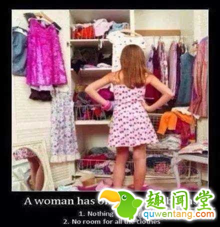 所以一个女人要同时面临的两个问题:1.没衣服穿了。2.衣服多得没地方放了!