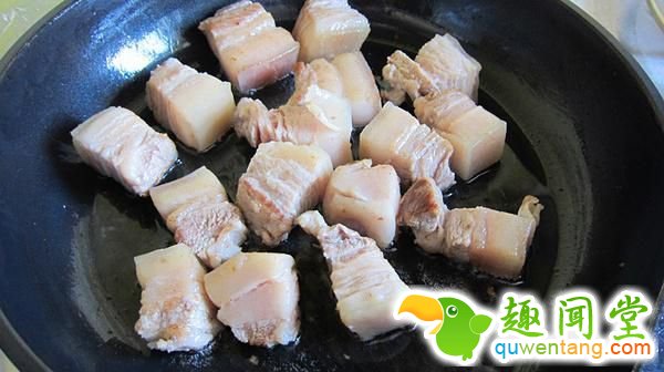 3、锅烧热放一丢丢油,将沥干后的肉煎至泛出金黄色。切正方形就是要四面都煎到?;褂衅ふ饷嬉惨骞钠だ锩婊嵊行∨菖莩云鹄春苡械?。啧啧,专业术语是弹牙?!菊饫锘鹨?,要随时翻面。煎好拿出备用.】