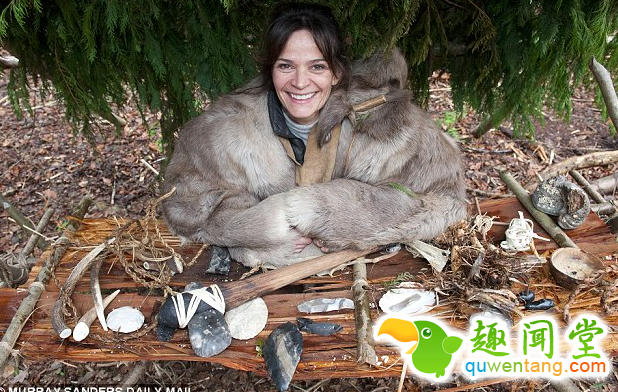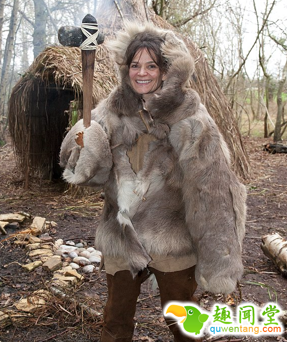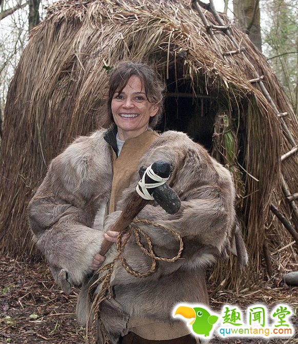 Jane所体验的“原始木质洞穴”位于英国牛津郡西部,是牛津大学古生物学研究所特意搭建的研究地,环境完全模拟公元万年前的石器时代。他们的装备有用鱼叉和鱼钩骨头做的燧石,用松木制成的树脂、木炭和蜂蜡,他们遇火会融化成胶,还有一个巨大的斧头抵挡野猪和熊等猛兽。