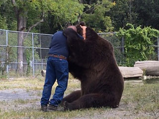 这头科迪亚克棕熊名叫Jimbo,也被叫做吉米(Jimmy),今年22岁,生活在美国纽约州奥蒂斯维尔的野生动物孤儿?;ぶ行?。57岁的吉姆科瓦尔奇克(Jim Kowalczik)和妻子苏珊一直照顾着它。 Jimbo的体重约为635千克。吉姆和妻子将Jimbo视为自己的孩子,从它还是幼崽的时候就照顾它,而Jimbo也将吉姆视为最好的朋友,总是要与他拥抱。 吉姆抚摸着Jimbo的背部,后者显得十分享受......