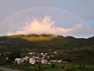2017年8月16日清晨,江西婺源,段莘乡中村坞头西边鄣母山现珍宝出世美景,勤劳早起的婺源市民用手机记录下这一幕。 鄣母山上,一条彩虹横跨山顶,一团白云正在生长,阳光照在山坡上,而山下的徽派村落已现几缕炊烟。 鄣母山与婺源著名的鄣公山对应,段莘当地人又称之为鄣虎山,即母老虎的意思。图为彩虹横跨。......