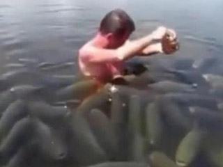 男子在河里游泳,顺便吃个薯条,没多一会,旁边就围满了大鲤鱼,本着分享精神,分一点给鲤鱼吃,可是,这么多也不够分的。 都说美国的亚洲鲤鱼不用任何渔具,开船去跑一圈,船上就有一堆鱼。但没想到竟然有这么强悍的鲤鱼数量。 这叫中国渔民情何以堪啊,中国渔民跑遍大江河流,山野小溪,都很难打到鱼了。听说,船员吃着一个大面包,不幸掉水里,然后就......