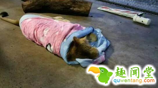 工作人员想了一下,虽然我们这里没法再给它一个豪宅,没法再给它一个床,一个“爷爷”,但是,我们好歹可以给它一个垫子和毯子,让它重新找回“床”的感觉……