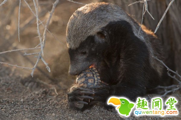 野生动物摄影师Morkel Erasmus在卡拉哈迪跨界公园拍到一只蜜獾捕食乌龟的一幕,可怜的乌龟最终还是没躲过被吃的命运成了蜜獾的盘中餐。