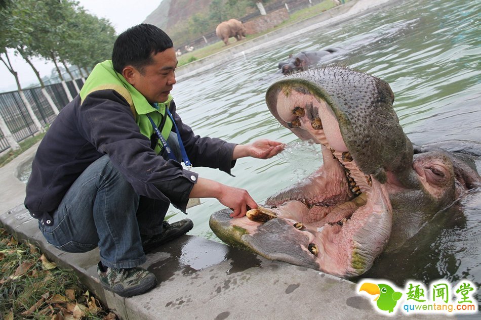 动物园一河马进食后卡牙 主动求饲养员剔牙