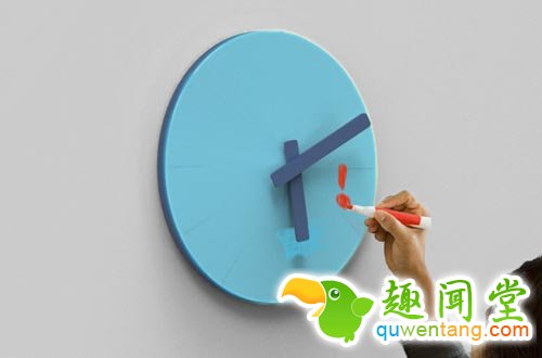 Shen Yuebo设计了一款创意挂钟Colour Clock,用户只需用记号笔在表盘上画下时间提醒的记号,到了确定时刻,钟面随即改变颜色,以此来提醒。你甚至可以用不同的颜色标记,指针上的颜色感应器都能读取,从而以一个关联的颜色显示。