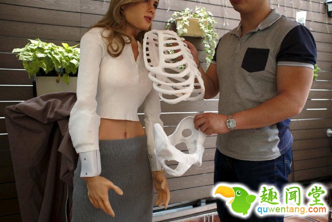 Mark 1的骨架是Ricky用3D打印完成的,皮肤则用硅胶制成。她的四肢和面部肌肉都可以活动,摄像头则内置在眼睛里。图为Ricky站在Mark 1的身旁,手里拿着3D打印的“骨架”。