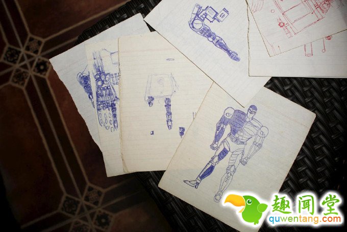 Ricky从小就有制作机器人的梦想。图为他小时候画的机器人草图。