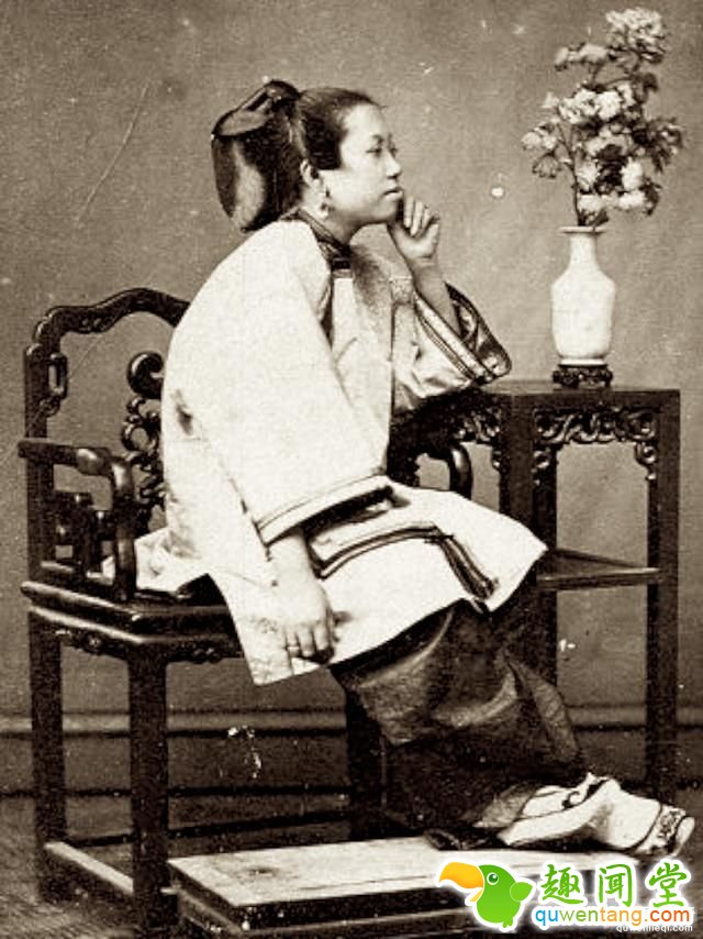 百年前晚清女子的真实形象:图为晚清妇女,斜坐在椅子上,单手拖着脸看着前方,若有所思,有点驼背。