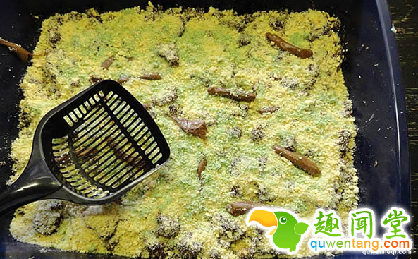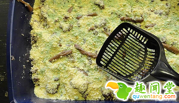 接着绿色食用色素加入剩下的饼干屑倒进猫砂盆,再捏些巧克力制造“层次感”,最后拿出猫砂铲分蛋糕。