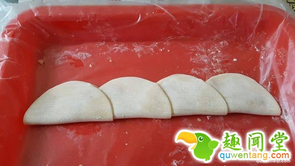 ▲饺子皮铺平相叠后放上内馅。