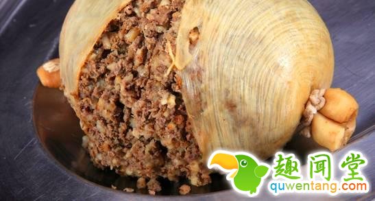 Haggis,做法是先把羊的瘤胃掏空,里面塞进燕麦、羊的内脏(如肝、心、肺、肾)再加上洋葱、动物脂肪油(suet)、牛肉、香料等。然后封好口,拿去煮,煮到鼓胀。