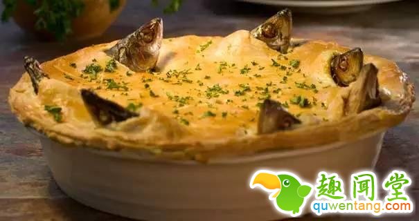 既然说到英国美食,那不得不提仰望星空派了。Stargazy pie ,又被叫做 starrey gazey pie。也是英国的一项传统食物,据说是在一个叫做Tom Bawcock's Eve的节日里吃的。这个食物,通过粗犷的把一些整鱼塞进派里的呈现方式,透出了人们对于探知星空的渴望(大雾