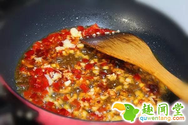第七步:锅中留适量的底油,油热后,加入少许豆瓣酱、剁椒、蒜末炒出香味。