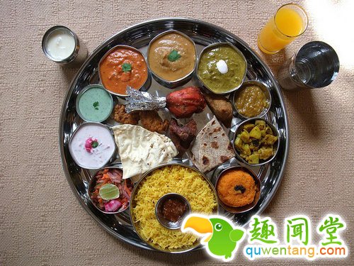 印度的食物在世界上独具特色。印度人做菜喜欢用调料,如咖喱、辣椒、黑胡椒、豆蔻、丁香、生姜、大蒜、茴香、肉桂等,其中用得最普遍、最多的还是咖喱粉??о凼怯煤贰⒔坪蛙钕愕?0多种香料调制而成的一种香辣调料,呈黄色粉末状。印度人对咖喱粉可谓情有独钟,几乎每道菜都用,咖喱鸡、咖喱鱼、咖喱土豆、咖喱饭……每个餐馆都飘着咖喱味。