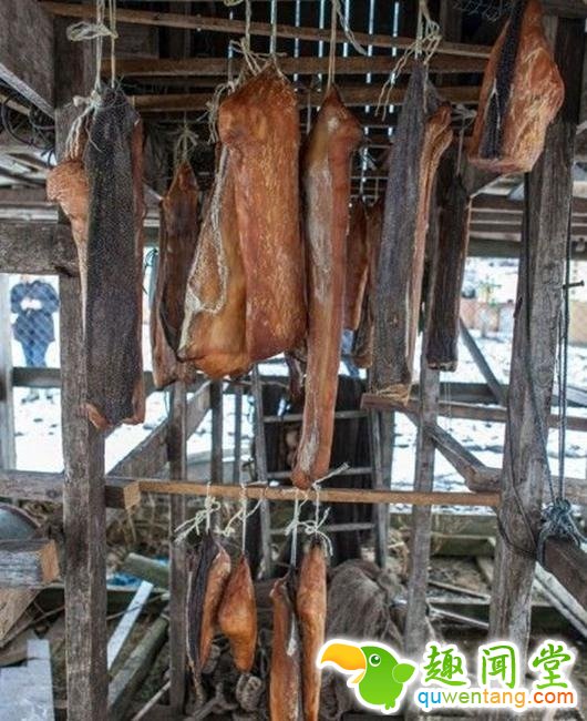 我们都知道入乡随俗这一说。在冰岛,这句话就意味着要咬一口臭鲨鱼,即鲨鱼的分解物。该鲨鱼被埋起来几个月,使其通过自身的体液进行发酵,然后切成一条一条的,挂起来风干。