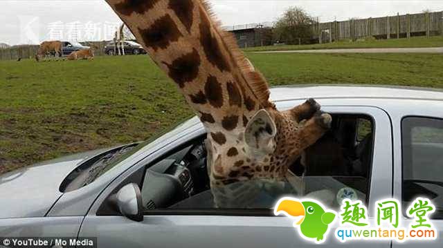众所周知,长颈鹿经?;嵩诟吒叩拇笫魃涎罢沂澄铩2还?,在英国伍斯特郡的一个野生动物园内,一只长颈鹿却低下头,把头探进一辆小轿车的车窗内,向游客们主动"乞讨食物"。