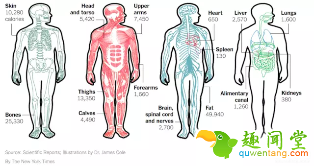 当然,Cole博士也清楚自己的研究有哪些问题。首先,研究的样本容量太小。因为他的人体卡路里数是基于四个成年男性的尸体得出来的,对女性身体各部分的热量并没有分析。而且,这些卡路里的数据都是在40、50年代别人研究人体的基础上,通过对比脂肪和蛋白质含量计算得出。