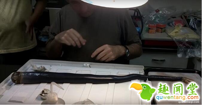 画面中,科学家先从较粗的一端切开凿船虫的壳,再轻轻摇一摇,一条超长、身上覆有黏液的黑色生物从管状硬壳里滑出。