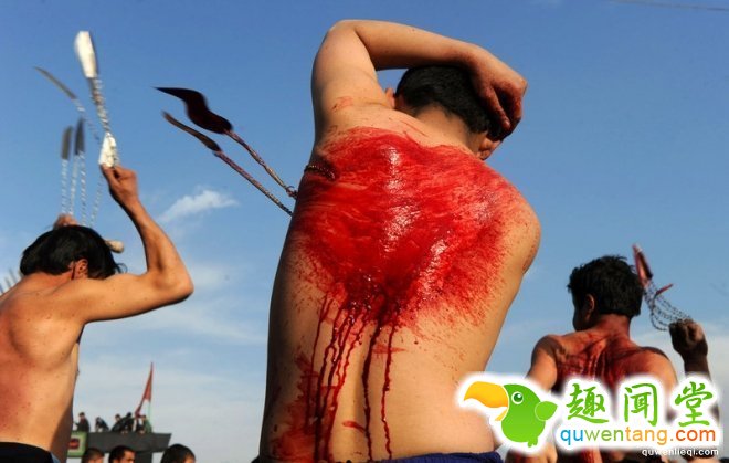伊斯兰阿舒拉节,教徒们正在向铁链拼命抽打自己,把自己打得鲜血淋漓,据说这样可以消除自己的罪孽。