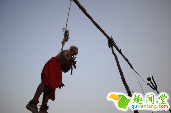 在孟加拉国的一个宗教仪式上,一名男子自愿被铁钩钩住,然后挂在杆子上。